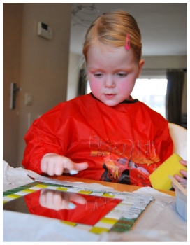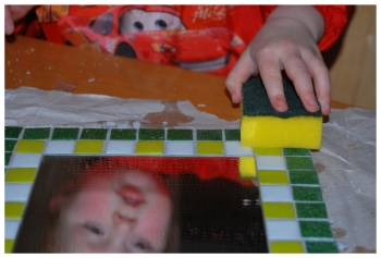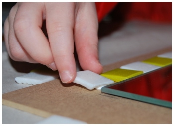 kloddertje lijm op de plaats waar een mozaieksteentje moet komen.